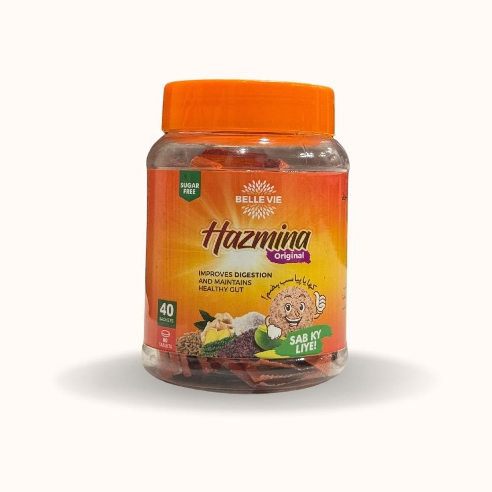 Belle Vie Hazmina Original is a traditional herbal digestive formula designed to support healthy digestion and relieve common discomforts like indigestion, flatulence, and bloating after meals. Rooted in South Asian wellness traditions, each sugar-free tablet combines time-tested herbal ingredients including Rock Salt, Cumin (Curcuma Cyminum), Black Salt, Black Pepper (Piper Nigrum), Ginger (Zingiber Officinalis), Long Pepper (Piper Longum), and Menthol in a convenient, chewable format. The jar contains 40 individually wrapped sachets with 80 tablets total — easy to carry, easy to share, and perfect for after-meal relief at home, at work, or on the go. Classified as an alternative herbal product. Manufactured by Focus & Rulz Healthcare, Pakistan. Distributed in North America by Mamoojan Com Inc.