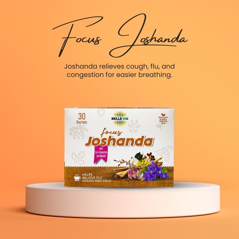 Belle Vie Focus Joshanda is a premium quality natural herbal tea rooted in the centuries-old South Asian tradition of Joshanda — a warm, soothing herbal infusion traditionally enjoyed during cold and flu season. Each box contains 30 individually wrapped sachets, crafted from a proprietary blend of eight herbal extracts including Salix alba (White Willow), Glycyrrhiza glabra (Mulethi / Licorice), Adhatoda vasica, Viola odorata (Gul-Banafsha), Valeriana officinalis, Thea sinensis (Tea), Foeniculum vulgare (Fennel), and Eucalyptus globulus. Simply dissolve one sachet in a cup of hot water or tea and sip slowly for a comforting, aromatic herbal experience. Made with natural ingredients. No artificial colors or preservatives. Manufactured by Focus & Rulz Healthcare, Pakistan. Distributed in North America by Mamoojan Com Inc.